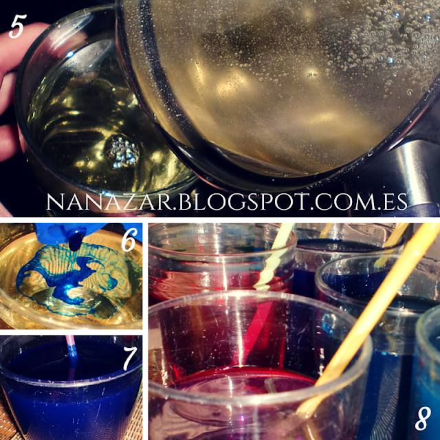 Después lo pondremos dentro de un recipiente (5) y lo mezclaremos con tintes concentrados o superconcentrados para pinturas al agua (6). Removeremos muy bien hasta que el color quede uniforme (7). En mi caso utilicé azul y verde e hice mezclas entre ambos para conseguir colores intermedios. Además, lo bueno de estos tintes es que dependiendo de la cantidad que echéis podrá saliros tonos más claros o más oscuros. Así que con dos colores tendréis una gran gama.
