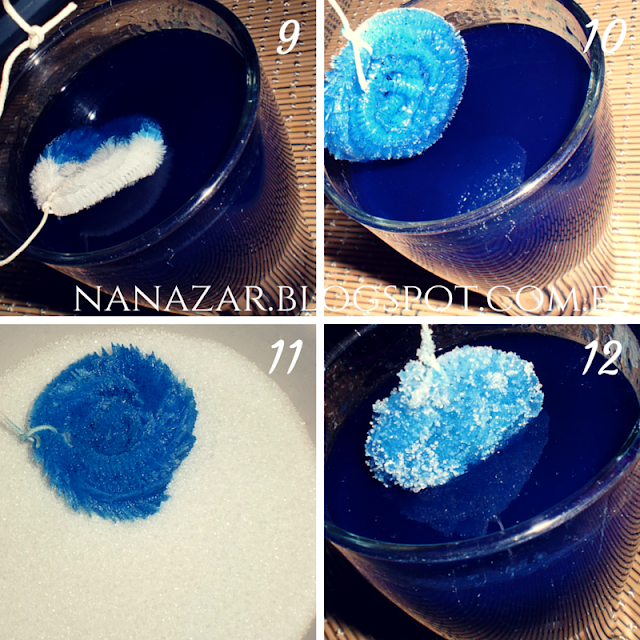 Cuando la mezcla esté templada o fría, meteremos el limpia pipas sólo para mojarlo (9 y 10), ya que tendremos que empaparlo en azúcar para que se quede pegada en el mismo (11). (Ahora después explicaré por qué) Y volver a ponerlo dentro de nuestro vaso (12). Para dejarlo reposar, es conveniente tapar los vasos con un trapo o algo para que no se ensucien con el polvo o la suciedad del ambiente.