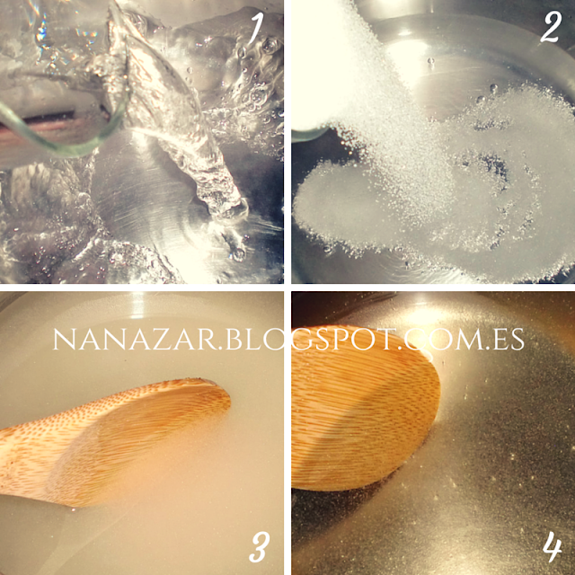 Con lo cual, echaremos en una olla agua (1) y azúcar (2), y disolveremos totalmente la mezcla (3) Y al final tiene que quedar como en la imagen (4) un líquido muy caliente, amarillento y transparente.